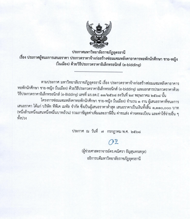 ประกาศผู้ชนะการเสนอราคา ประกวดราคาจ้างก่อสร้างซ่อมแซมหลังคาอาคารหอพักนักศึกษา ชาย-หญิง