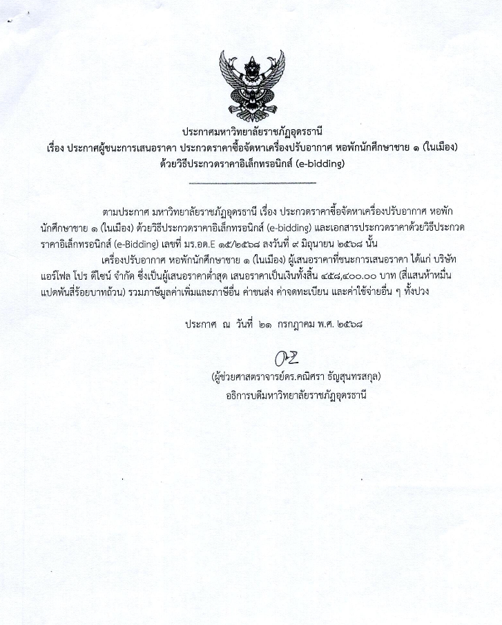 ยกเลิกประกาศรายชื่อผู้ชนะการเสนอราคา โครงการจัดหาเครื่องปรับอากาศ หอพักนักศึกษาชาย 1 (ในเมือง)