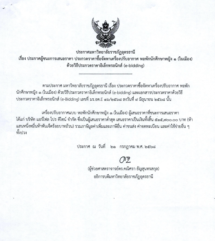 ยกเลิกประกาศรายชื่อผู้ชนะการเสนอราคา โครงการจัดหาเครื่องปรับอากาศ หอพักนักศึกษาหญิง 1 (ในเมือง)